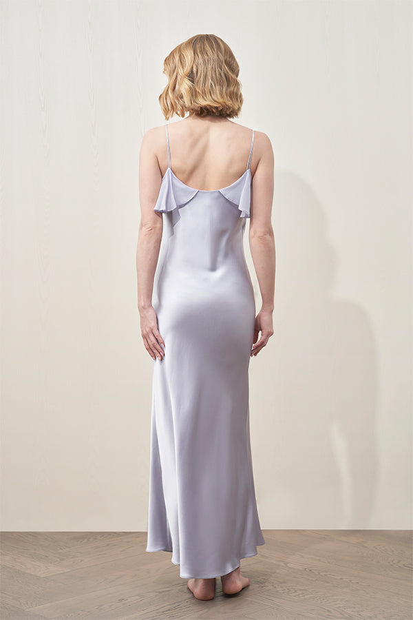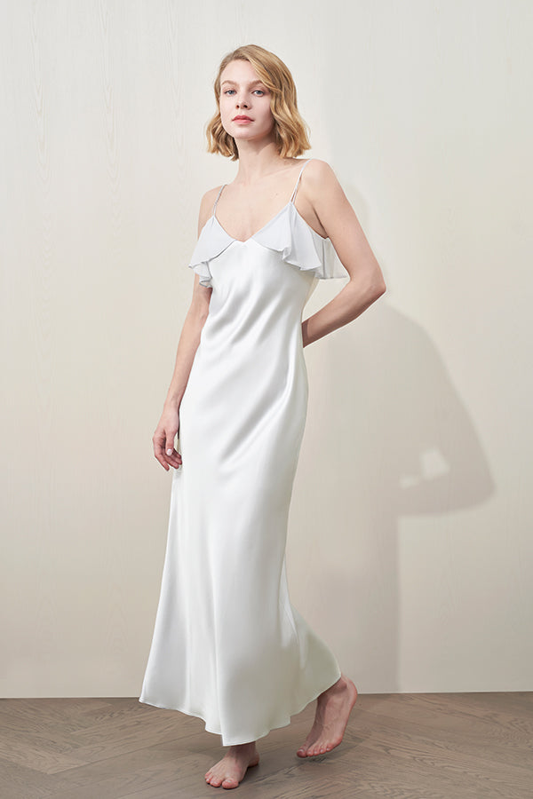AURORA 吊带连衣长裙灵感触碰海风拂浪的柔美瞬间,匠心裁剪修身廓形适配多元场景。甄选30姆米素绉与乔其纱创新叠搭,垂缎面映衬薄纱,质感轻盈相映成趣。经典净茶白诠释隽永格调,幽兰紫调氤氲朦胧诗意。双吊带结构辅以领口层叠纱饰,细节处尽显灵动巧思以匠心工艺诠释当代女性优雅着装美学。