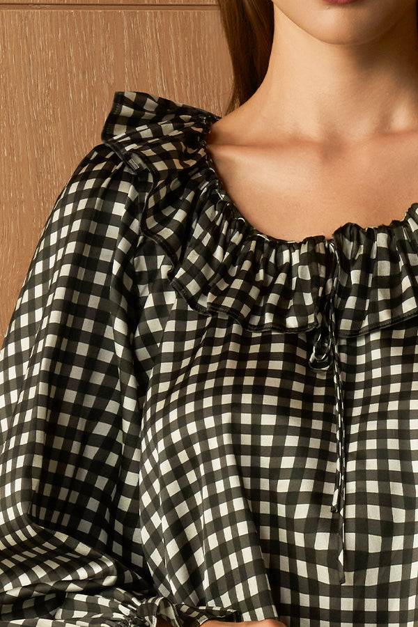 - 桑蚕丝素绉缎面料,天然成份触感丝滑,荷叶边装饰俏皮可爱,宽松时尚的版型包容性强。