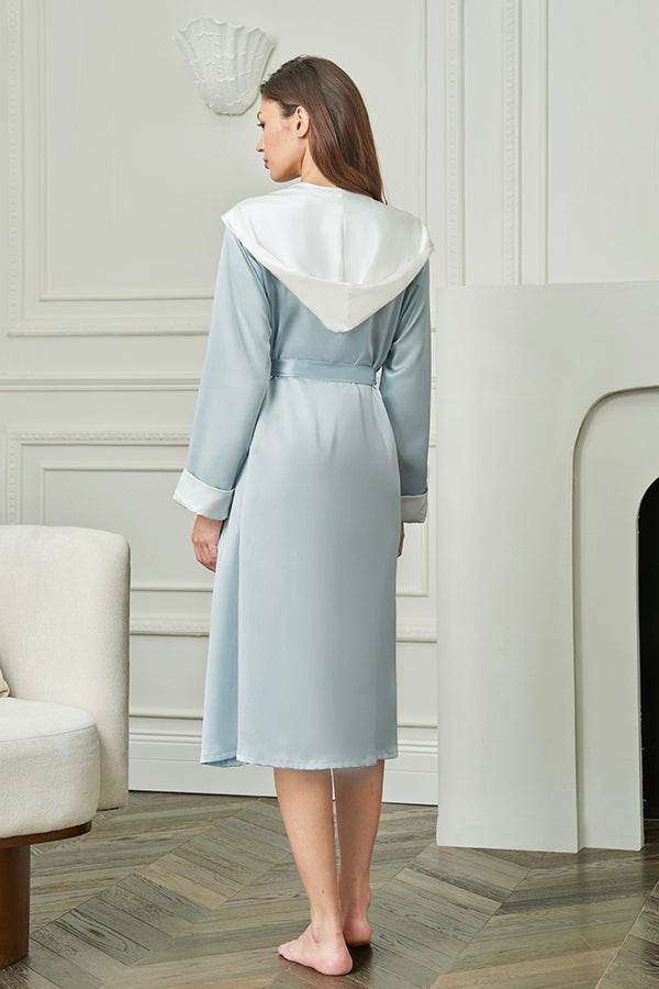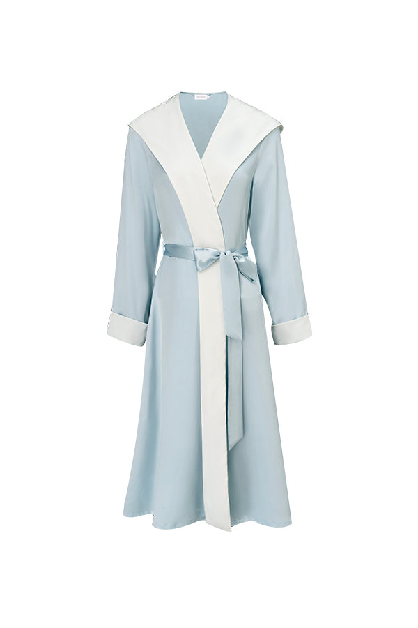 Calla女士连帽睡袍以22姆米桑蚕丝素绉缎织就云朵般柔滑触感。婴儿蓝色调如晨雾拂面,连帽翻领垂落修饰肩颈,翻边袖口利落慵懒。一件懂肌肤的睡袍,是质感生活的温柔注解,衣长适中精准平衡居家舒适与轻外穿,让晨起咖啡时光或旅途休憩皆成优雅仪式。