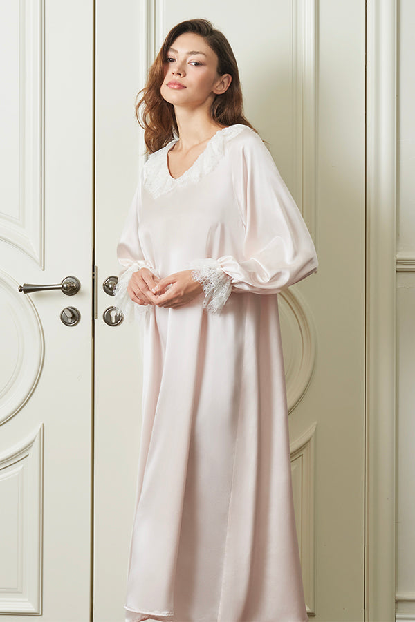Court 蕾丝连衣裙以22姆米桑蚕丝素绉缎面料赋予肌肤云端触感,A字裙型巧妙修饰身形,双层蕾丝V领如晨露中的花瓣般柔美绽放,垂坠泡泡袖与精致蕾丝袖口展现优雅细节。净荼白款诠释纯粹格调,芭蕾粉款演绎浪漫风情,打造如梦似幻的“睡美人”风格。
