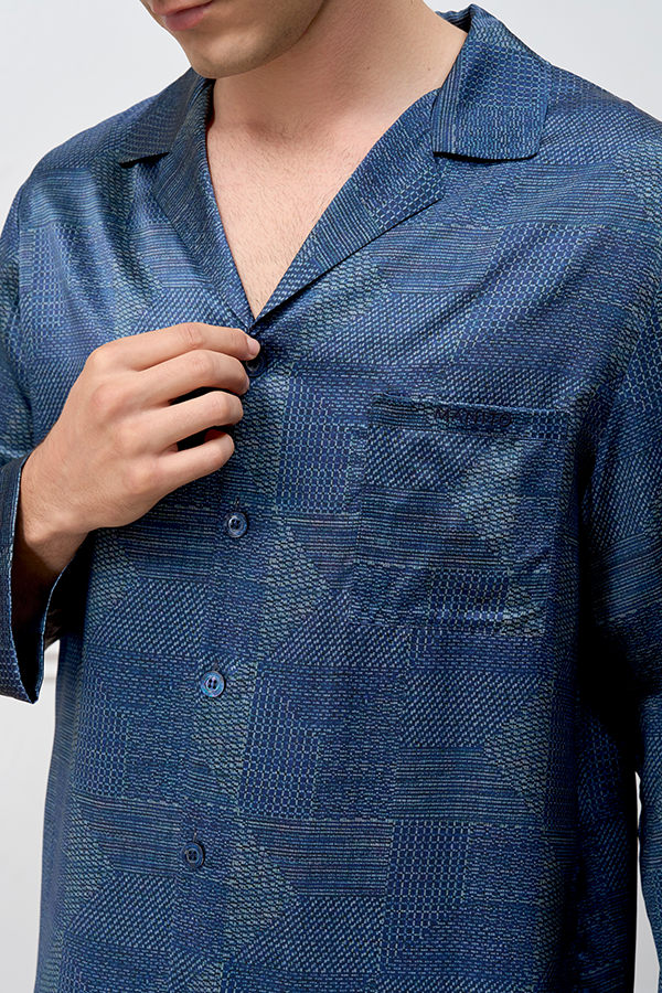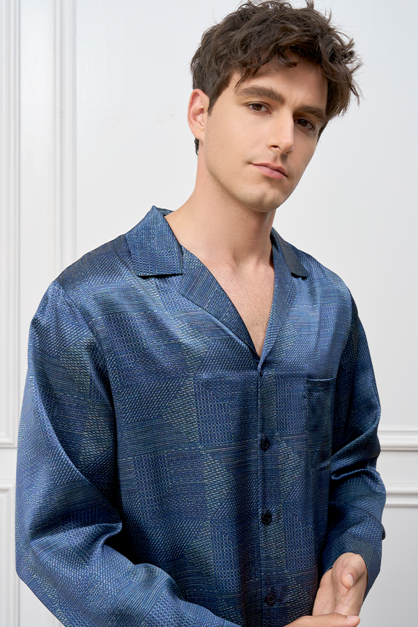 Cube男士家居服套装经典男士家居服以理性美学重塑睡眠艺术,22姆米素绉缎以桑蚕丝织就月光般丝滑触感,设计师从几何构图中汲取灵感,通过精密排列的点阵暗纹与直线元素,在深蓝底色上构建视觉秩序感。立体绣花logo点缀,与暗纹形成光影层次,既满足男士对低调奢华的审美需求,又适配居家阅读、会客等多场景穿着。
