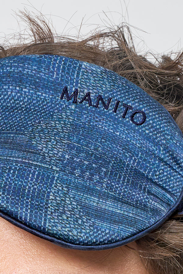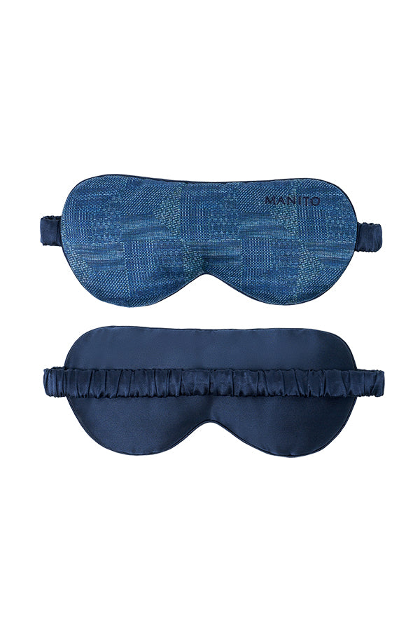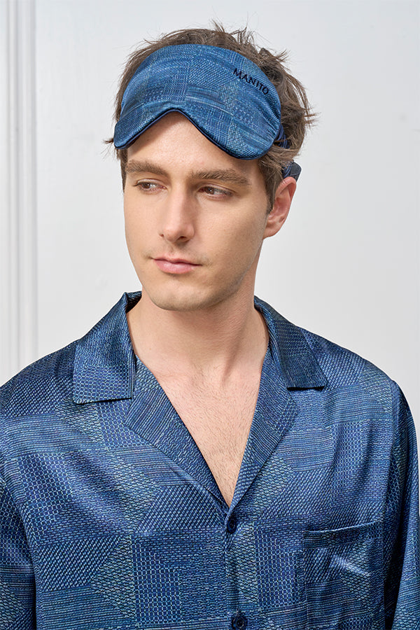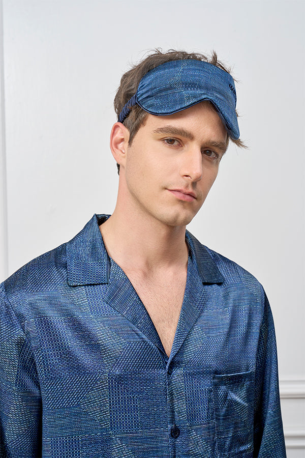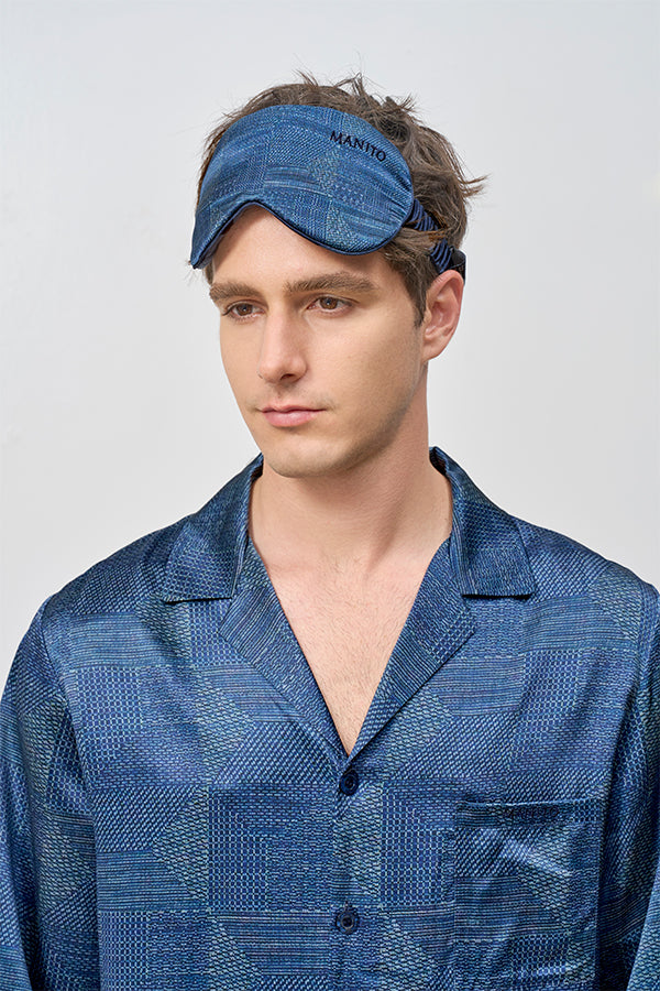 Cube 男士眼罩以理性美学重塑睡眠艺术,22姆米素绉缎以桑蚕丝织就月光般丝滑触感,设计师从几何构图中汲取灵感,通过精密排列的点阵暗纹与直线元素,在深蓝底色上构建视觉秩序感。丝滑细腻,亲肤透气,减少眼部压迫感。