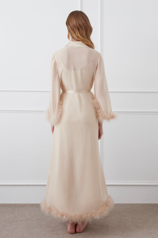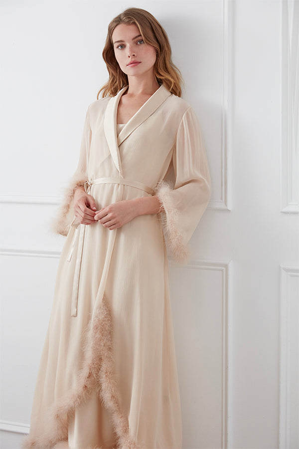 • 半透明的桑蚕丝乔其纱羽毛睡袍。