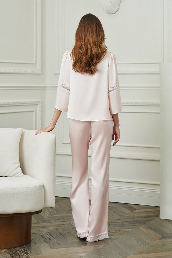 Dream 蕾丝女士睡衣套装精选桑蚕丝素绉缎面料,带来全天候的舒适享受,让每个翻身都沉浸在云朵般的触感中。汲取浪漫主义美学的家居服套装,用芭蕾粉的温柔笔触勾勒居家体验。方领剪裁搭配手工蕾丝花边,精致的白色蕾丝花边装饰领口和袖口,细节考究,增添女性柔美气质。