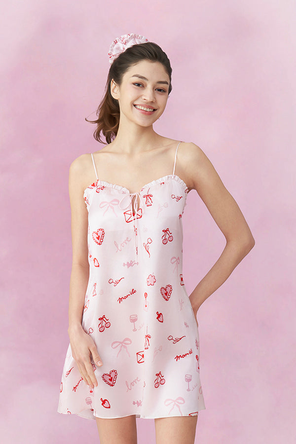 Love Notes 女士桑蚕丝吊带睡裙情人节限定浪漫,将樱桃、爱心等甜美元素铺满衣身,复刻初恋心动。甄选桑蚕丝素绉缎,贴合身形无束缚,柔亮光泽尽显精致。淡粉色调柔和衬肤,木耳边点缀细节。既是节日送礼佳选,亦是日常甜系穿搭,让仪式感与舒适感常伴。