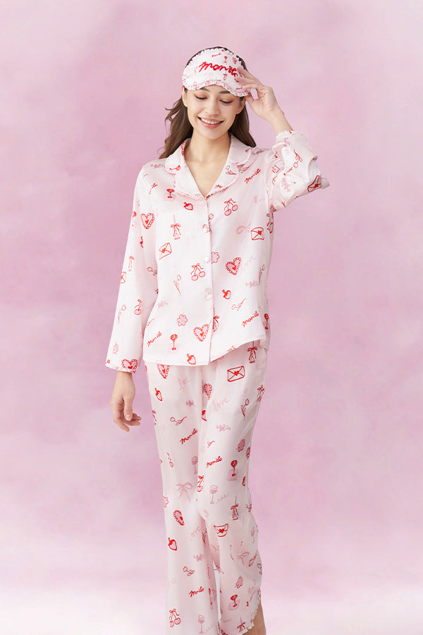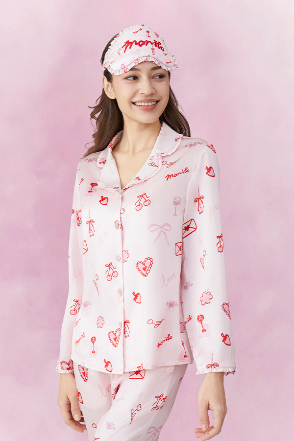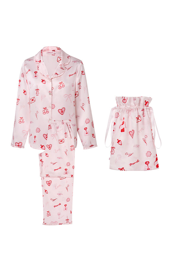 Love Notes 女士桑蚕丝睡衣套装情人节限定浪漫,樱桃、爱心等甜美元素铺满衣身,复刻初恋心动。甄选桑蚕丝素绉缎,柔亮光泽尽显雅致。淡粉色调柔和衬肤,领口裤脚木耳边点缀细节。既是节日送礼佳选,亦是日常甜系穿搭,让仪式感与舒适感常伴。