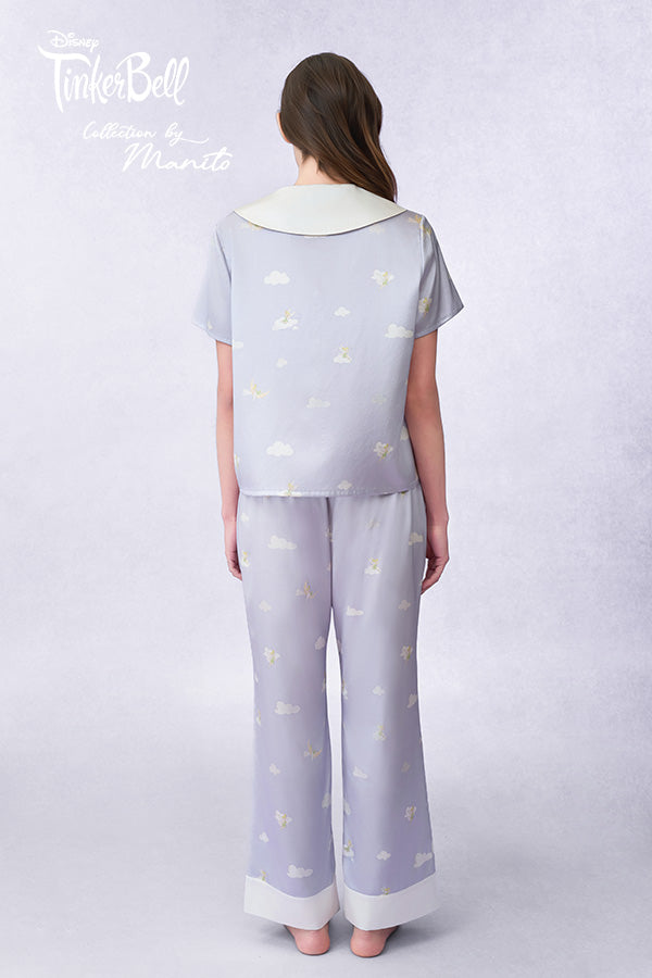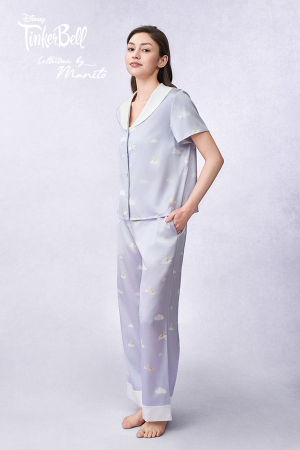 MANITO迪士尼奇妙仙子合作系列 Moonglade Dream女士桑蚕丝短袖睡衣套装,以仙子云端嬉戏之灵感,将精灵漫游云海的轻盈浪漫,藏进每一寸肌理。甄选桑蚕丝弹力素绉缎,触感柔润亲肤,低饱和精灵紫温柔衬肤,白色翻领搭配满印图案趣味十足,云朵贝壳扣彰显细节巧思,宽松版型俏皮灵动,兼具童话氛围感与轻奢优雅,伴每一段舒适时光。