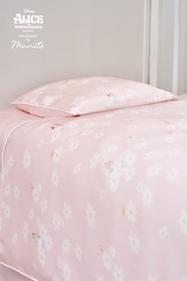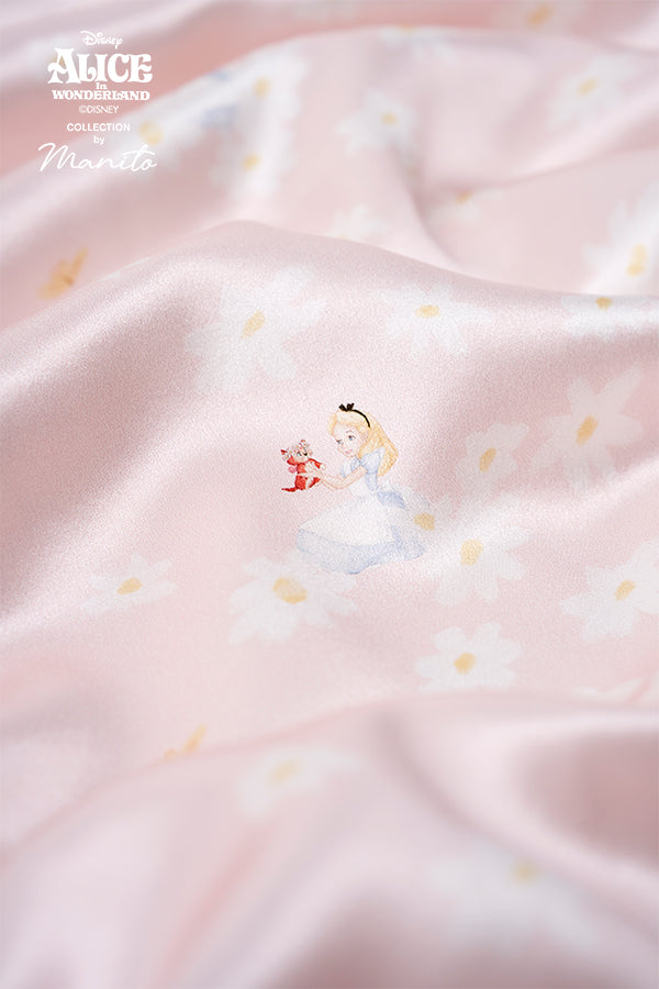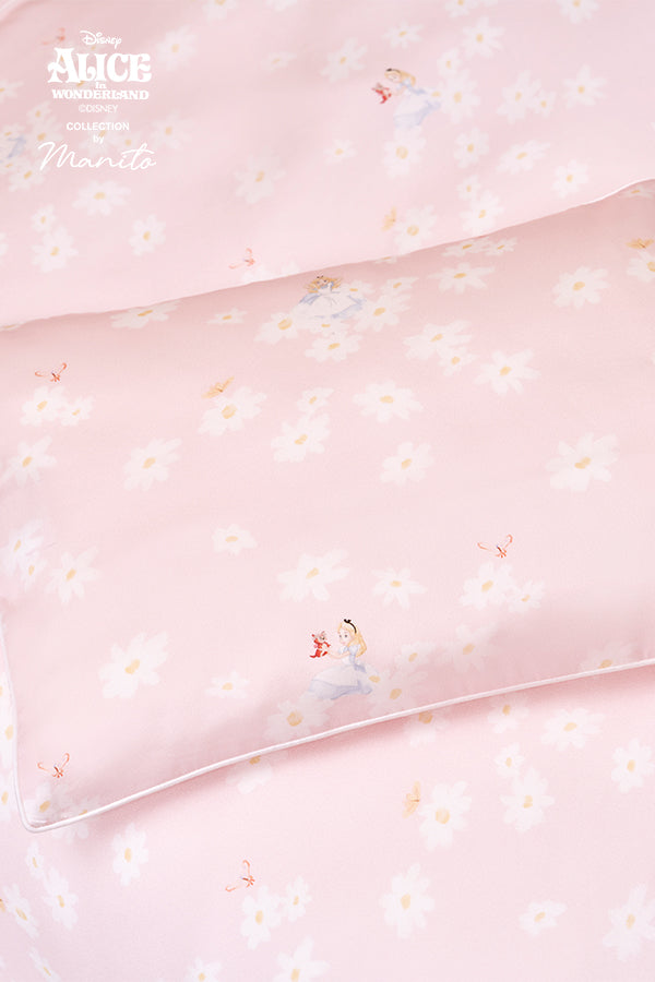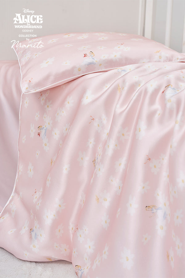 MANITO 迪士尼爱丽丝合作系列Daisy儿童床品五件套汲取灵感,手绘雏菊花园中巧妙融入爱丽丝。当第一缕晨光吻上雏菊花环,爱丽丝的梦境在桑蚕丝的柔雾中苏醒。为儿童设计的五件套,用蚕丝编织童话,奇境粉的温柔是妈妈哼唱的摇篮曲具象化。三种爱丽丝造型随翻身变换故事章节,超柔包边线守护每寸娇嫩肌肤。