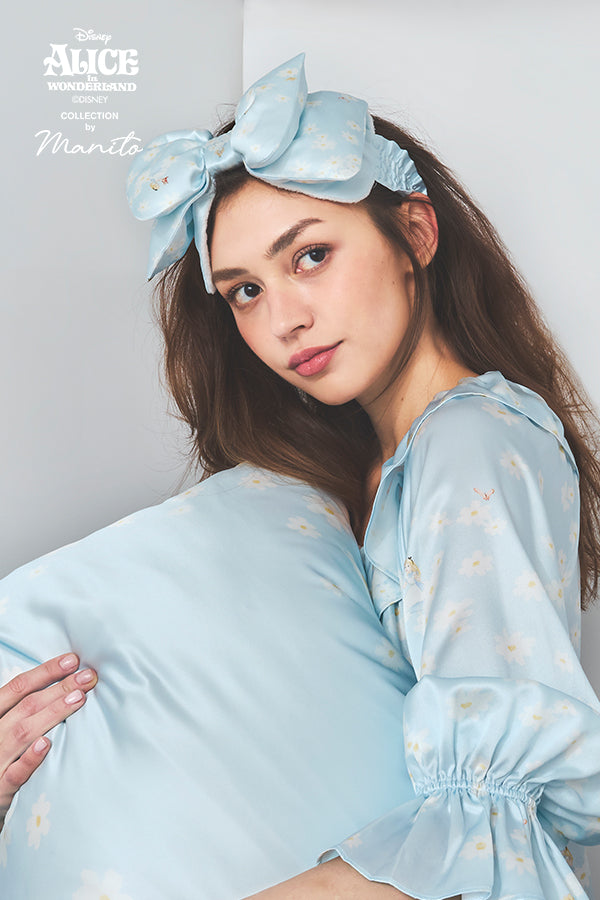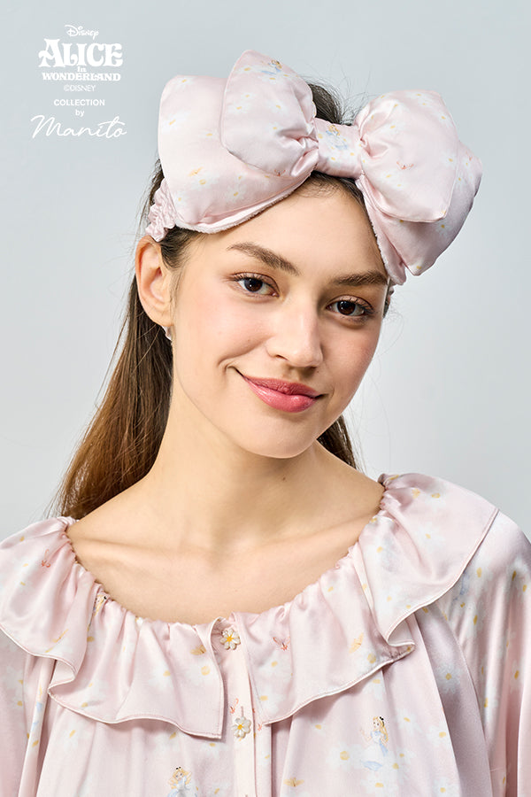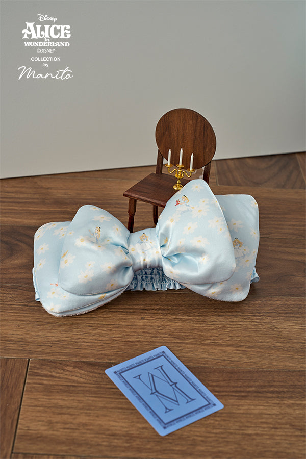 MANITO迪士尼爱丽丝合作系列 Daisy蝴蝶结发带从经典动画开场汲取灵感,手绘雏菊花园中巧妙融入爱丽丝,维多利亚时代雏菊花语"天真纯洁"与爱丽丝童真气质呼应。立体充棉蝴蝶结俏皮灵动,奇境粉/蓝双色适配不同居家场景;松紧绑带设计适配多种头围,毛巾料内层呵护秀发。