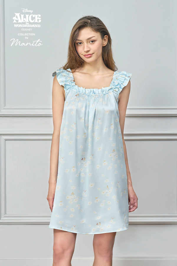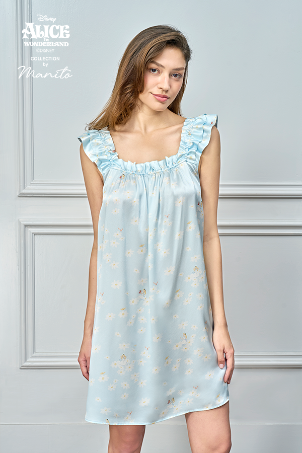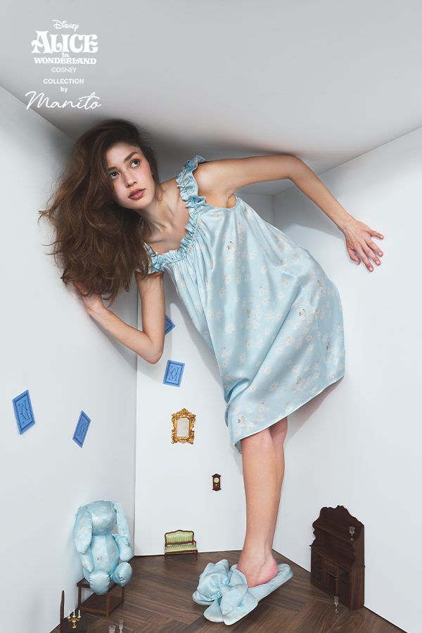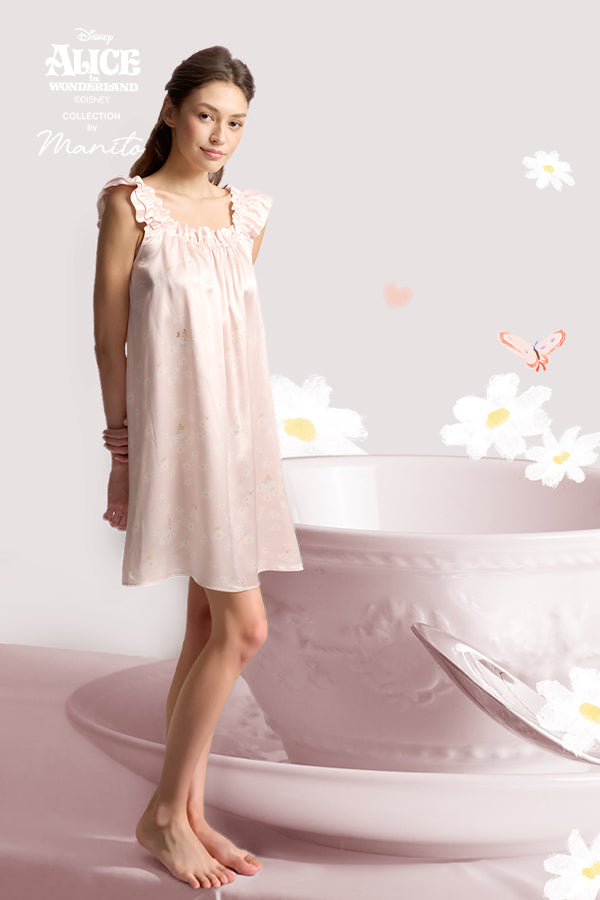 MANITO迪士尼爱丽丝合作系列 Daisy 桑蚕丝木耳边短裙以经典动画开场桥段为灵感,手绘雏菊错落绽放,爱丽丝隐现花间,巧妙呈现梦境与现实交织的奇幻氛围。维多利亚时代雏菊花语"天真纯洁"与爱丽丝童真气质相映成趣,花瓣放射状线条暗喻梦境延伸。精选22姆米桑蚕丝素绉缎面料,如云朵般亲肤透气,奇境粉/蓝双色可选,还配备收纳袋。俏皮木耳边装饰搭配短款剪裁,既保留睡裙舒适性又兼具外穿时尚度,让每个转身都绽放迪士尼黄金时代的浪漫魅力。