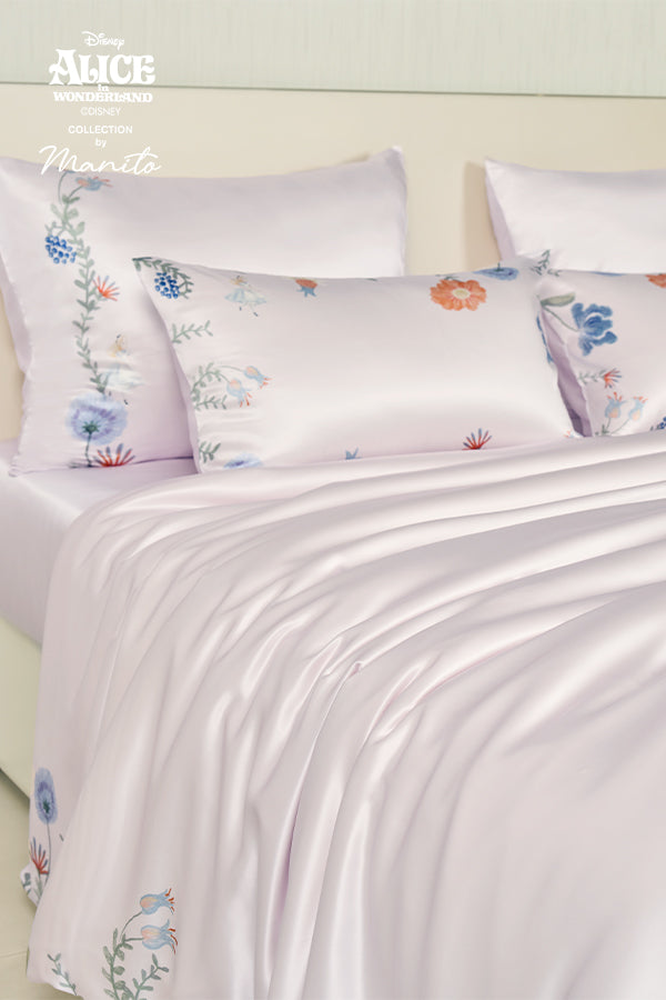 MANITO迪士尼爱丽丝合作系列 Fantasy Forest 床单四件套采用22 姆米真丝素绉缎触感柔软丝滑,手感柔软丝滑,品质感藏在每一寸织物里似将奇幻森林的灵动定格,睡前仿佛能与爱丽丝一同穿梭其间。躺进这片柔软,让每一夜休憩都成了与梦幻的温柔相拥。