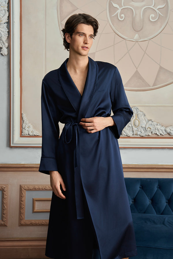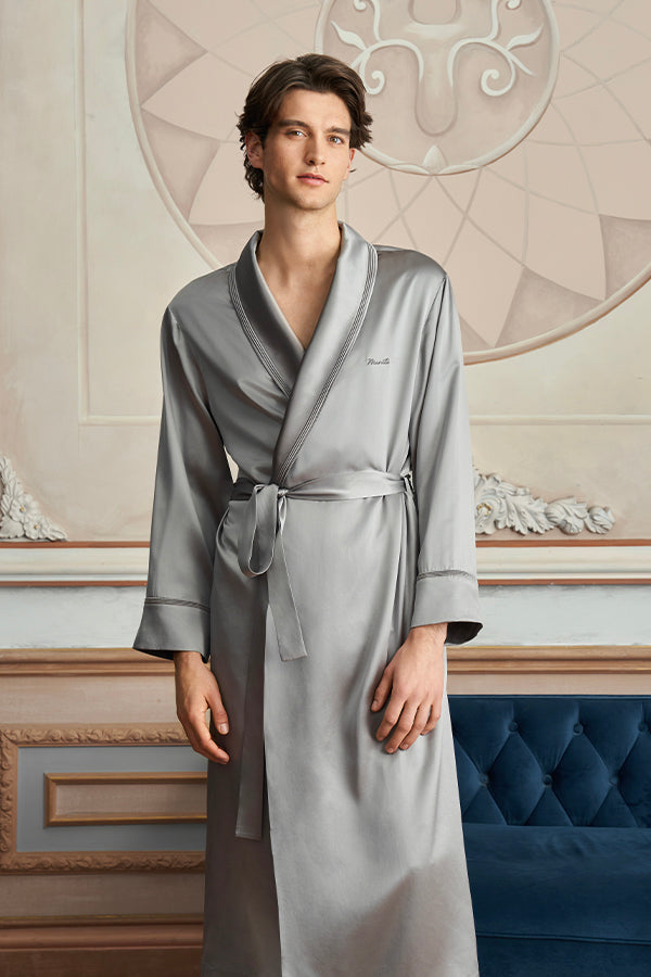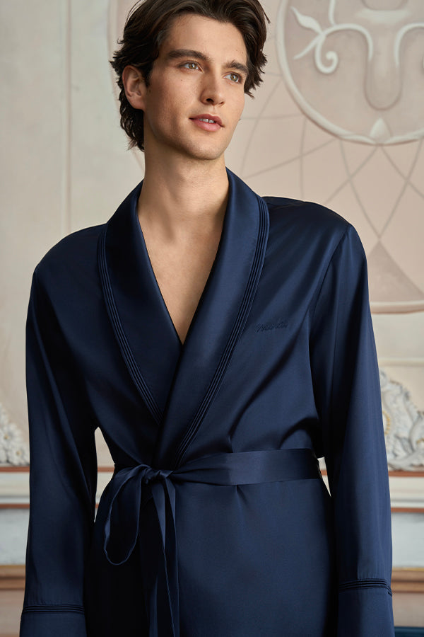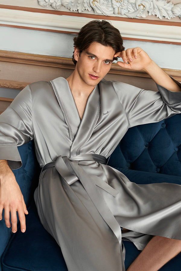Patrician 男士睡袍以细节雕琢居家精致感,重新定义舒适与优雅的边界。灵感源自简约法式格调,宽松廓形不拖沓,搭配可束腰设计,随性披穿显自在,系上腰带塑利落,雅致与干练轻松切换。精选高品质桑蚕丝素绉缎,触感顺滑如丝,自然光线下泛着细腻光泽,透气排湿的特性,让肌肤时刻享舒适。