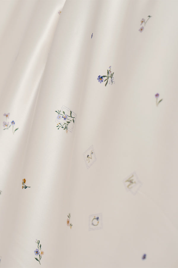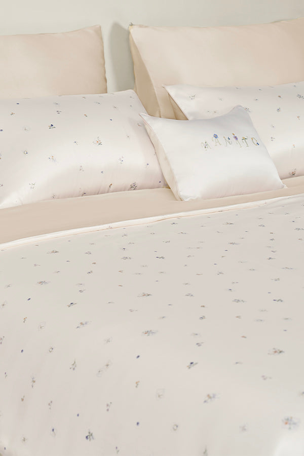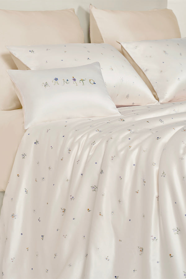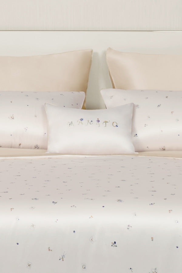 Sweet Garden床品四件套甄选 22 姆米桑蚕丝素绉缎,触感丝滑如云朵轻拂,杏仁米色底缀着不甜腻的清新碎花,印花里 MANITO 元素以集邮形式体现,似将品牌印记藏进枚枚精致邮章,风过更有浅香漫溢。无绳出芽勾勒细腻层次,搭配香槟灰反面撞色,一套床品,两种温柔格调,尽藏集邮般的精致心意。