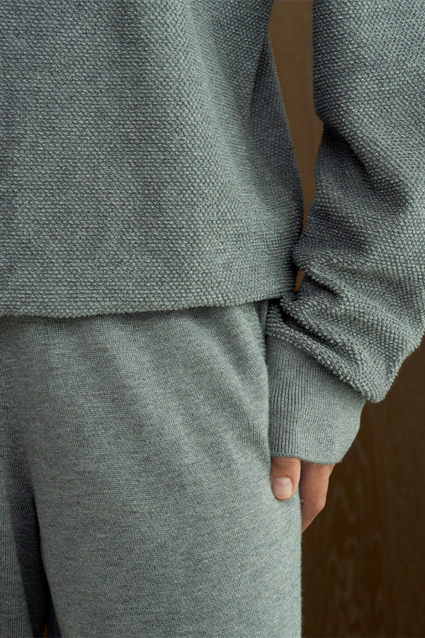 Terra 女士针织套装灵感来源于大自然地表的微植物对大地的覆盖及包裹感,当特殊的肌理织造与经典平针在衣身相遇,如同苔藓与岩石的自然对话。桑蚕丝的流光邂逅羊毛的骨感,再糅入羊绒的温柔,这件上衣便成了可触摸的材质诗篇。指尖划过那些精心设计的织面凸起,能同时感受到蚕丝的凉滑与羊绒的暖糯,这种矛盾而和谐的触感,正是高级材质才能呈现的穿戴艺术。